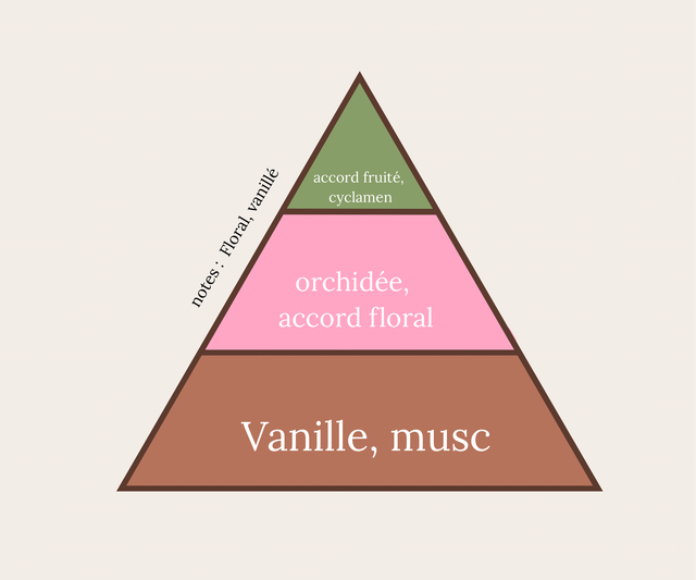 Un parfum délicat et élégant qui apporte une douceur florale immédiate. L'accord fruité et le cyclamen offrent une ouverture fraîche et lumineuse. Le cœur d'orchidée et d'accord floral apporte une fleur blanche douce, raffinée et apaisante. En fond, la vanille et le musc laissent une empreinte tendre et réconfortante.